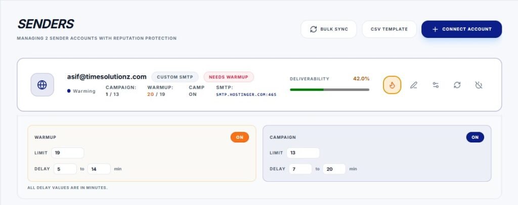 Manage multiple sender accounts with individual SMTP/IMAP settings, warmup limits, and campaign delays.